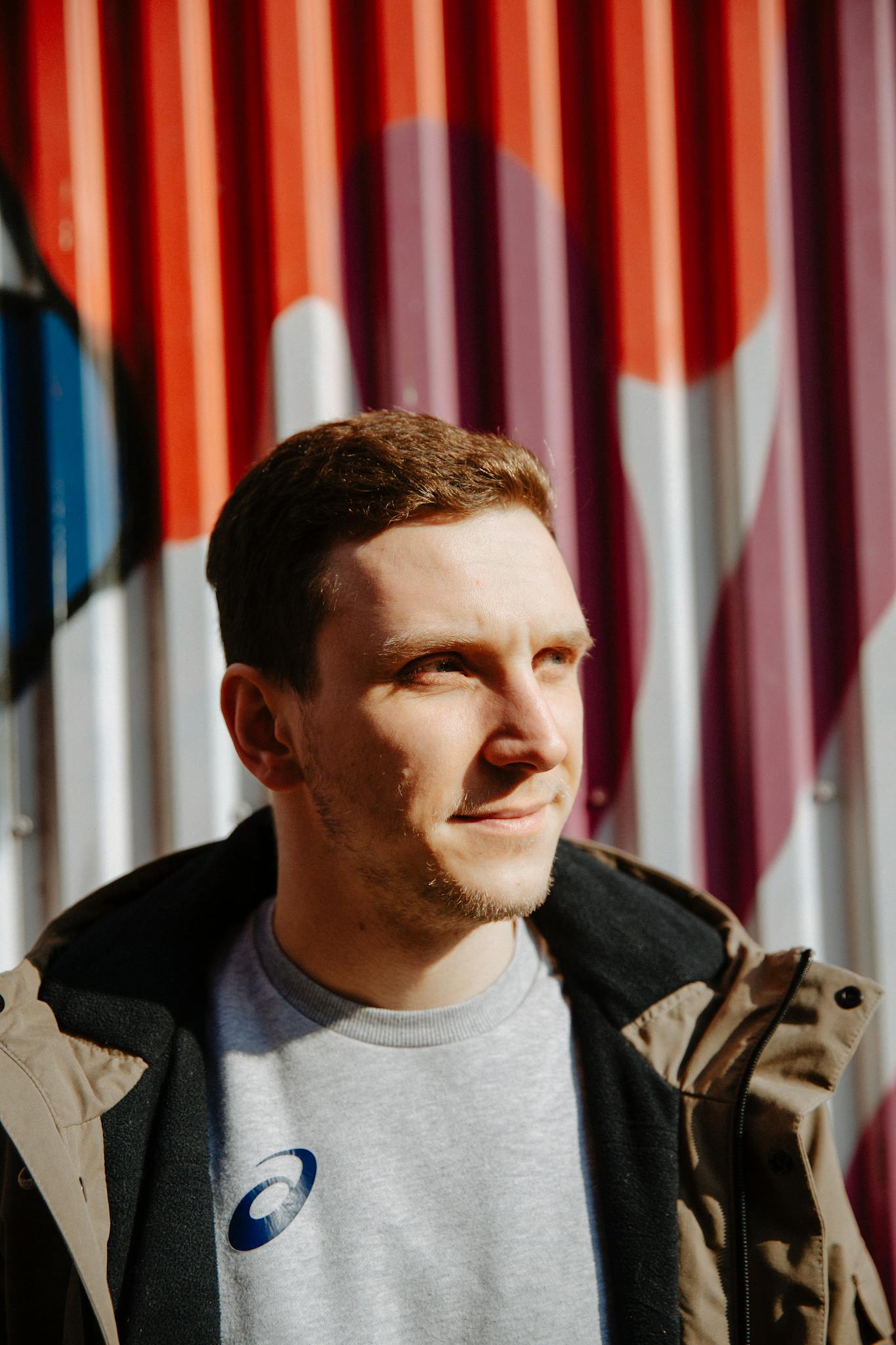 Security guard in uniform standing outdoors on a city street, maintaining public safety.
